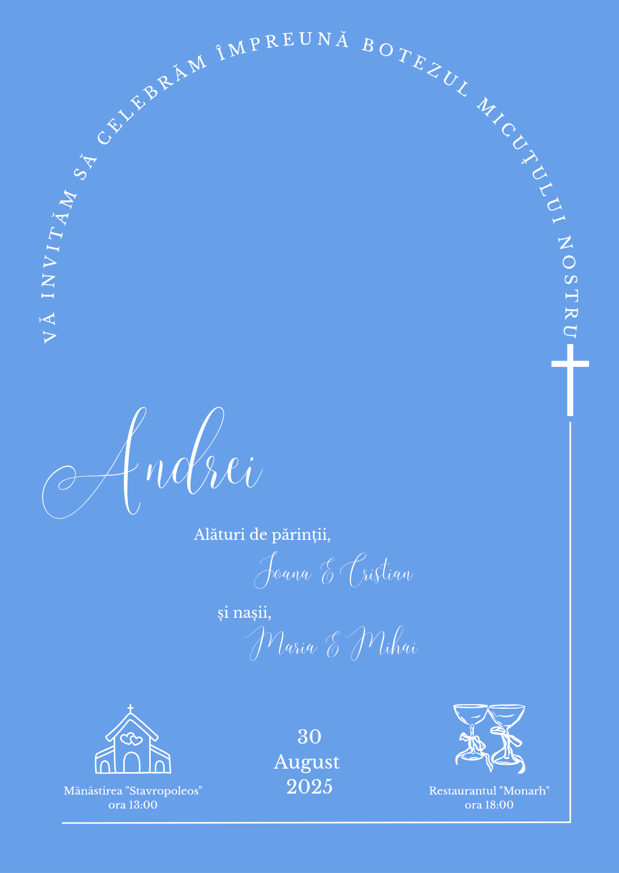 Această invitație este o declarație de stil. Nu este doar o invitație, ci o piesă de design ce celebrează botezul micuțului vostru într-o manieră sobră și modernă.