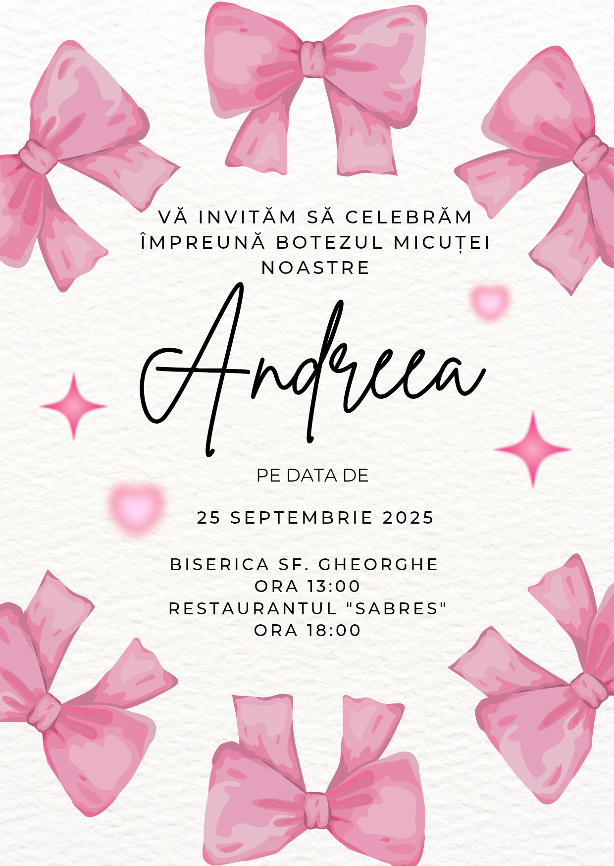 Pregătește-te pentru un moment magic! Designul "fundița delicată" este o creație digitală absolut adorabilă, plină de farmec și vis, perfectă pentru a anunța evenimentul. Magia jucăușă a fundiței roz pudrat, împreună cu steluțele și inimoarele subtile, creează o atmosferă de poveste, iar caligrafia elegantă asigură un stil chic de neuitat. Nu este doar o imagine, este o promisiune a unei sărbători pline de iubire și bucurie pură. Achiziționezi un fișier digital de înaltă rezoluție, gata personalizat și pregătit instantaneu pentru a fi trimis pe telefon. O alegere compactă, dar cu un impact uriaș!
