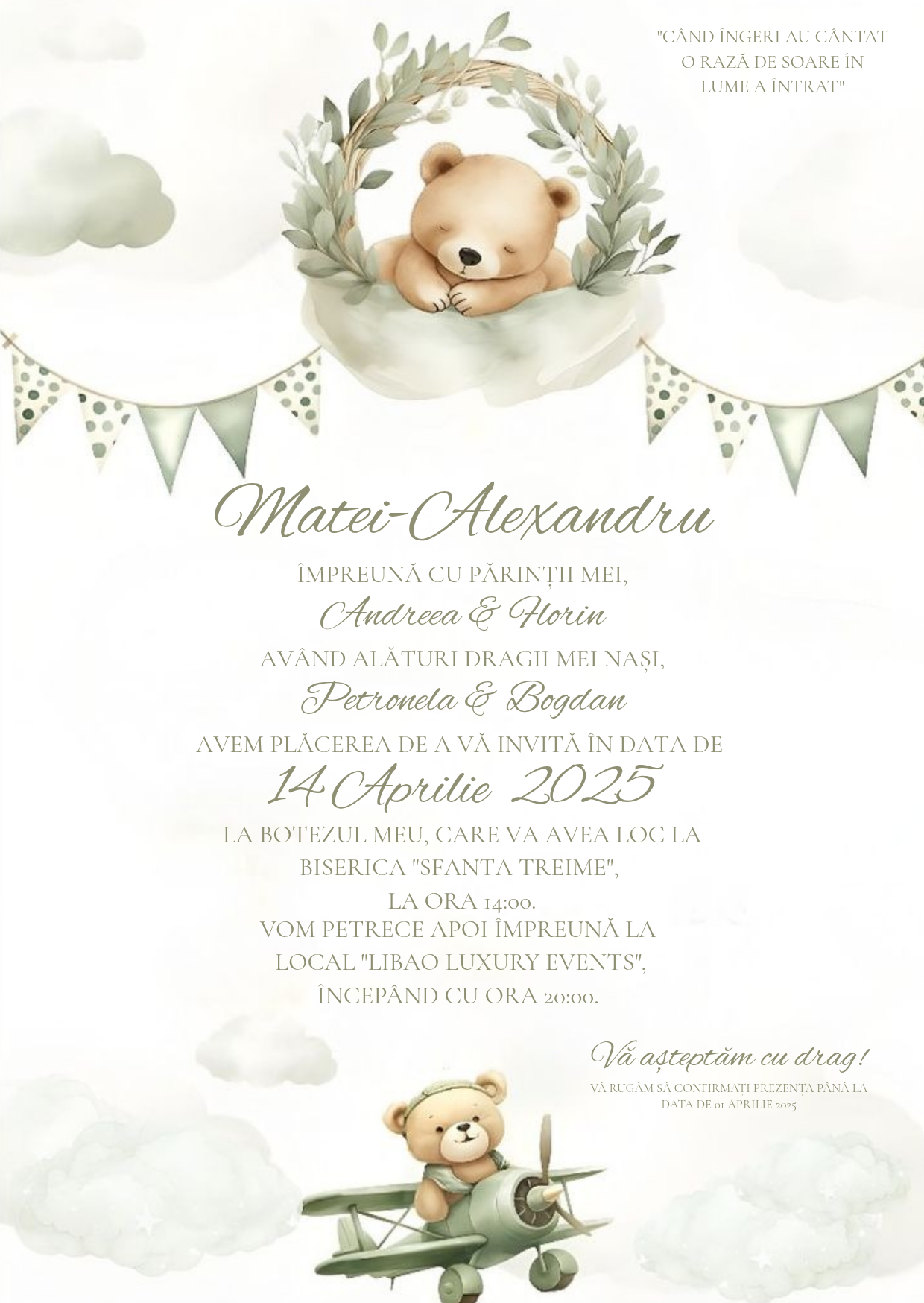 O invitație plină de tandrețe, decorată cu un ursuleț adormit printre frunze și nori pufoși.